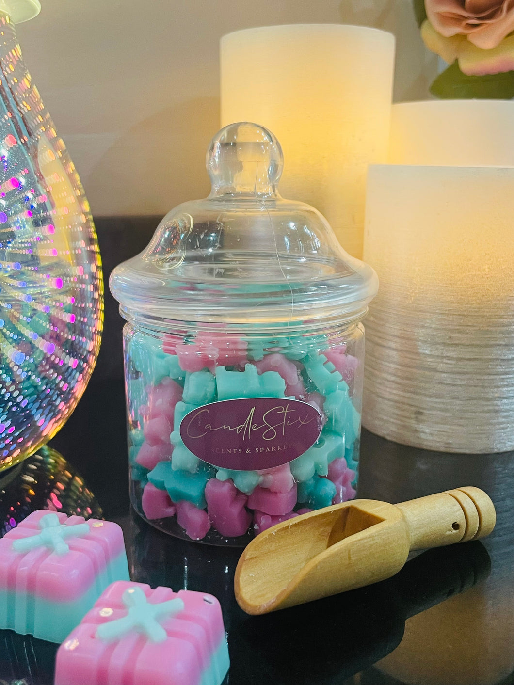 A cute little plastic Victorian sweet shop jar filled with strawberry and lily gummy bear wax melts.